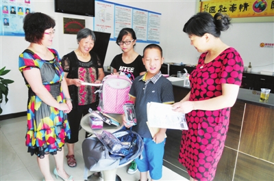 “你的微心愿,我们来实现”,近日,城北街道凤凰山社区开展微心愿征集活动,社区的张馨月小朋友从小由奶奶带大,蔡宇轩小朋友父亲患尿毒症多年,家庭条件都十分困难,孩子们的微心愿很简单:新学期有个新书包。婺城区人力资源和社会保障局的党员们从社区得知后认领他们的心愿并帮助他们圆梦。党员们给孩子们带来了慰问金和新书包,孩子们看到书包里还有文具盒、课外书、笔记本等文具都很惊喜。记者 汪胜 通讯员 戴莹 摄