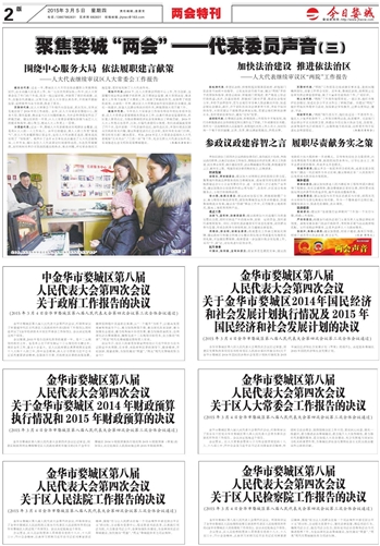 戴维平代表:今年的人大常委会工作报告和往年相比有很多创新,区人大常委会紧紧围绕各项重点工作,认真行使法定监督职权,抓好重大事项决定,为推动婺城经济社会发展做出了积极贡献。2014年人大工作亮点也很多,比如,乡镇代表接待日制度。我们汤溪镇就安排了四个点,每次安排三个代表接待选民,接待选民后,并及时将选民群众反映的有关问题、建议和意见进行汇总分析,及时向有关部门反映,移交给有关部门解决落实。再如,2014年区人大常委会还组织人大代表视察“五水共治”、“三改一拆”等工作,充分发挥人大代表主体作用,有效推进生态文明和美丽婺城建设。(本报记者综合)
