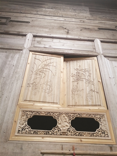 再看这一幢幢古建筑,乍一眼无甚变化,细细品味却是惊喜连连。瞧,这是左右对称的两个雕花木窗。从色泽看,一新一旧区别明显,可上头的木雕画竟然画风统一,相互融合成了一个整体。不说两个窗户下部的镂空雕刻,只说各自两扇木窗门,均刻有孩童放牧图,搭配梅兰竹菊“四君子”的背景,连雕刻深度、大小比例都达到了高度一致。而类似情形,在一些梁柱、牛腿、墙画的修补上均有体现。“等我们将这些新木的颜色做旧后,整体就会更加和谐。”一旁负责该村古建筑修缮的工程单位负责人邵文杰如是说。