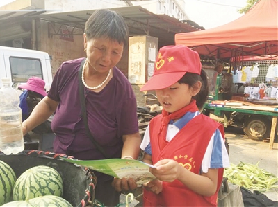“阿姨你好,请看一下垃圾分类宣传册!” “叔叔,垃圾分类这样做才是正确的。”……当天,尽管天气炎热,但孩子们每人手中抱着一叠自己设计的宣传册,忙碌地在综合市场里来回奔跑,分发给路人和商家,用热情感染了每一个人。
