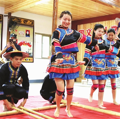 来到塔石的第一站,就是高塘村的畲族文化礼堂。高塘村是一个少数民族村,刚一下车,畲族的老百姓就为来宾送上了畲族的风情斗笠。抬眼望去,一眼就能看到文化礼堂外墙墙面上画着两只颜色艳丽、展翅高飞的凤凰。解说员介绍,凤凰山是畲族的发源地,凤凰也便成了畲族的标志。走进礼堂,一楼为文化之堂,内设七廊,介绍了高塘村的一些由来故事,现场村民跳起了竹竿舞,让不少人也迫不及待地上前体验了一把。