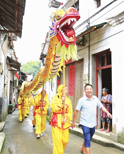 在塔石集镇的吊桥头下了车,大家首先前往塔石乡文化礼堂进行参观,这里以前是演剧院,现在主场地是体育馆,刚刚前几天举办了全国老年休闲气排球赛,有32个代表队,300多人参加,展示了塔石的多功能文体经济及全乡文化。在舞龙队的带领下,大家沿着集镇老街步行前往上塔石村文化礼堂,古街依然保存着古朴的风韵,长长的老街,没有拐弯抹角,呈一字型,贯通着上下塔石。