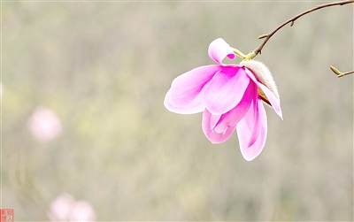 忽而一阵寒风吹过,路人寒碜不堪,紧紧卷起身躯。抬头,邂逅那支支绒笔已经悄然舒展奔放,露出紫色花蕾,偶尔一片花瓣嘣然绽放。春天来了,春天来啦!路人急忙松开紧紧的大衣,张口任风儿吹拂,宽衣待春爽入润肤。此风虽然寒冷,已非北风,转至东南风,是辛夷特意的嗅觉撬开了路人的麻木。