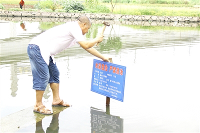 据了解,湖头村由7个自然村组成,共有37口池塘,通过前期摸底调查,现今为每一口池塘都按上“身份证”,该“身份证”主要明确了水体名称、水域面积、和塘长责任人等信息,落实塘长职责的同时也健全了提升水质的长效机制,有力保证了劣V类水“病症”不复发。除此之外,该“身份证”也起到了安全警示的作用。记者 罗肖 摄