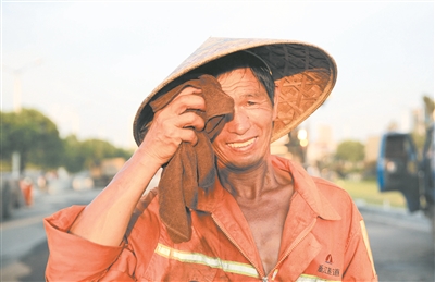 宾虹西路改造路段上的工人们赶在早上6点多开工,为道路铺上沥青,高温炙烤的路面就像要融化了一般,踩在上面能从脚底感受到地面60℃的高温,一天下来胶鞋底都有点软了。工人徐祝前笑呵呵道:“这样工作习惯了,也没觉得特别辛苦,多喝点水就好了。”汗水中的笑容显得非常灿烂。