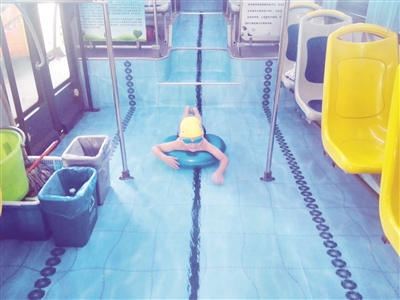 据了解,此辆可“游泳”的公交车,是由金华公交营运二公司的工作人员和8路线驾驶员朱妙娟和汤惠圆共同布置的。据她们介绍,自入夏以来,金华持续高温,为了改善乘客乘车时的环境,朱妙娟和汤惠圆突发奇想,在网上定制蓝色游泳池材料,用高清户外进口环保防滑车贴,花了一整天的时间来布置,将仿真游泳池搬进了车厢,让乘客大呼惊奇。