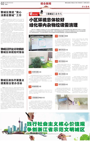 城中街道御江帝景作为知名的高档小区,在小区内环境优美,绿化区域内基本没有杂物垃圾,社会主义核心价值观宣传在明显位置,但该小区内绿地提示牌较少,公益广告基本没有。