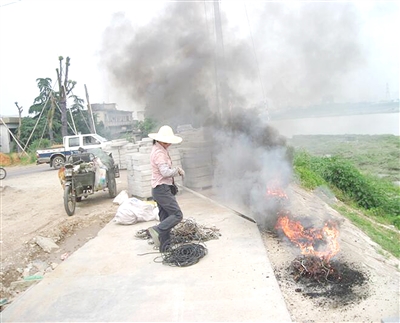 经询问,焚烧垃圾的吴某是废料收购人员。据她介绍,这些焚烧的废弃电缆线都是她从各处收购回来的,为贪图方便,才选择了露天焚烧处理。