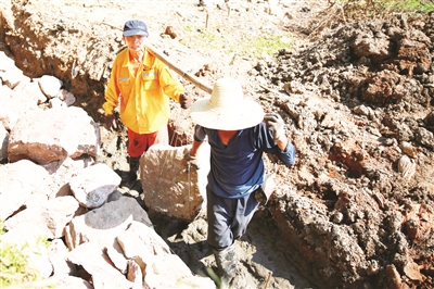 相关负责人告诉记者,“村民们很重视,我们保水护水的脚步也不能停歇。”近日天气渐凉,池塘积水很浅,借着这个机会建一条环绕池塘的护坡挡墙,既防止了沿岸的水土流失,也能方便村民通行。与此同时,清除池塘淤泥提升岩湖水质供村民浇灌农用。记者 罗肖 摄