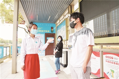 近日,记者在婺城区部分商场、医院、公交站台等人流量较大的公共场所看到,现场有不少志愿者及管理人员坚守在岗位,引导市民正确佩戴口罩,提醒大家测温亮码。在公交车站工作的刘女士告诉记者,现在大家出行都很自觉,自我防护意识也有所提高,正确佩戴口罩不仅保护自己,也是保护他人。