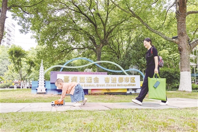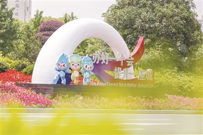 “喜迎亚运会、奋进都市区”“迎亚运、讲文明、树新风”……在迎宾大道、八一北街、东市北街等各主干道沿线,印有这些字样的道旗随处可见。除了路边的亚运元素,在环城北路与迎宾大道交叉口的花坛中,巨型草雕景观与亚运元素相结合,犹如一幅画卷徐徐铺展。