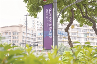 在人民西路上,也能实时看到亚运主题的道旗,即便附近的工地围挡上,也布上了满满的亚运元素的公益广告,氛围感十足。