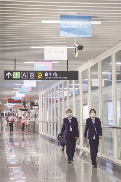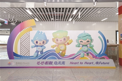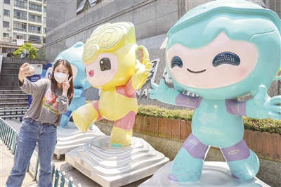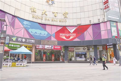 头戴“饕餮纹”的“琮琮”、盖着“荷叶帽”的“莲莲”、额嵌“拱宸桥”的“宸宸”,在西市街商圈内,本届亚运会的“江南忆”组合吉祥物被制作成了景观小品出现,吸引许多市民围观“打卡”。作为婺城时尚中心,西市街商圈内的led大屏上,也实时循环播放着亚运主题的各类公益广告,十分显眼。
