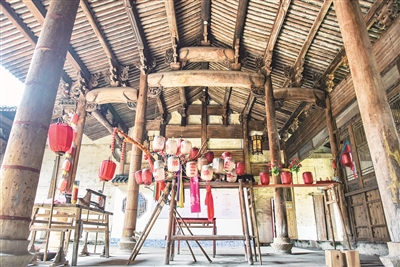 在村中,有一座始建于明成化七年的滕氏宗祠,又名种德堂,为浙江省文物保护单位。走进宗祠,只见气势宏伟,前后四进三天井,雕梁画栋,线条明快,较为完好地保留了明代建造时的风貌。