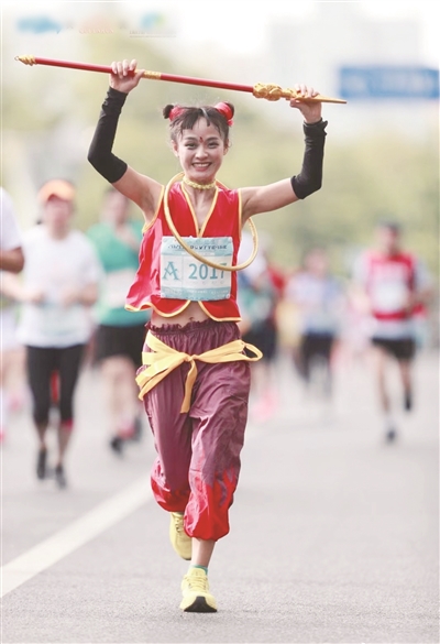 百度搜索她的名字,一张张新闻照片立马浮现于眼前。她扎着丸子头、身披混天绫、眉间还点着火焰印记,俨然是一个破次元壁的女版“魔童”,奔跑在马拉松赛事现场,脚下生风,笑靥如花。