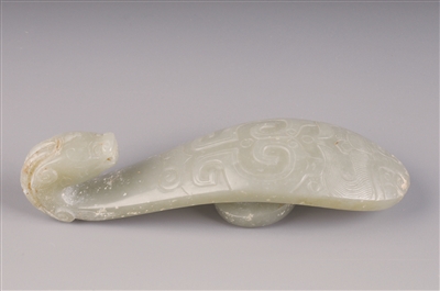 | 宋龙首琵琶形青玉带钩 国家一级文物,1994年婺城区红湖路附近南宋郑继道家族墓出土。整体呈琵琶形,浅浮雕双螭龙纹,底部有一圆钮,钩首为龙。一般为当时人们用在腰带上的挂钩饰品,起到束腰的作用,后被文人士大夫赋予寄物思情的雅玩之物。 |