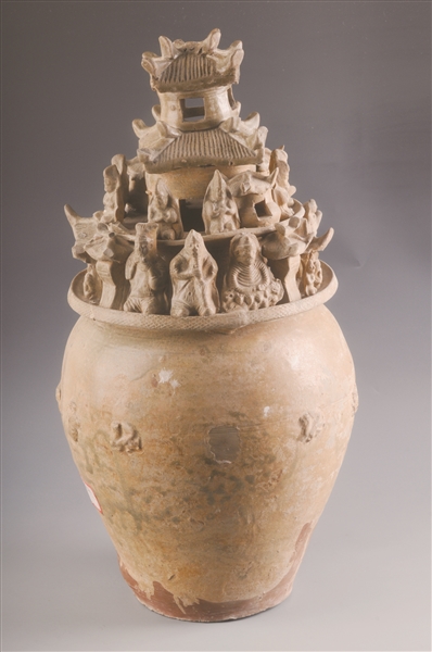 | 青瓷谷仓 1976年白龙桥镇古方砖瓦厂出土,是江南地区西晋时期的典型器之一,象征着五谷丰登,祈福子孙。通过肩部以上的堆塑纹饰,也反映了当时政治、经济、人文方面的一些属性。 |