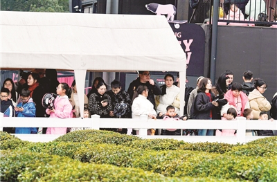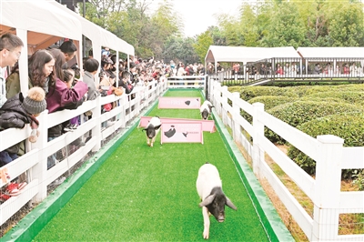 2月16日,在婺城区的熊猫猪猪乐园,不少游客在观看小猪赛跑。当天,天气晴好,气温回暖,市民纷纷来到户外赏景游玩。