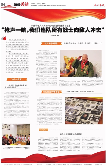 伴随着“轰”的巨响,炮楼内火光冲天。“当时,我左手拿着枪,右手拿着手榴弹。枪声一响,我们连队所有战士向敌人冲去。”趁着混乱,孔宪德和战友们冲进炮楼,与残余的敌人展开了近身搏斗,最终全歼敌人。激烈的战斗中,孔宪德右小腿中枪,落下残疾。“爷爷您真厉害。”听闻孔宪德在炮火中的故事,孩子们竖起大拇指。